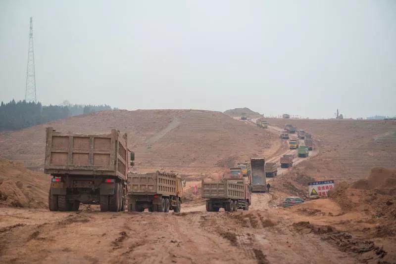 工程自卸車在機場建設(shè)便道上川流不息,從這兒能一窺填方高度