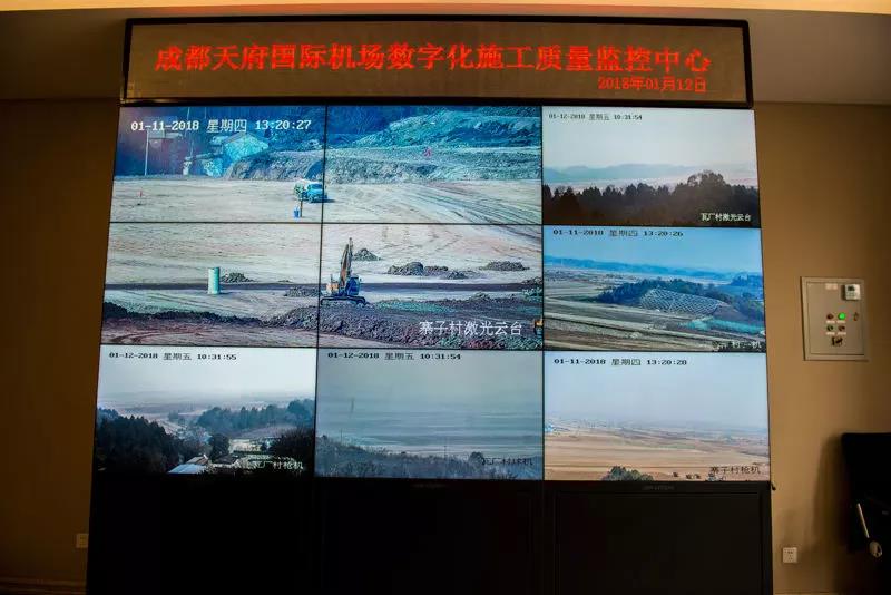 記者在成都天府國際機場數(shù)字化施工質(zhì)量監(jiān)控中心看到,大屏幕上一共有9個分屏顯示建設(shè)現(xiàn)場的施工狀態(tài)。工作人員介紹說,施工現(xiàn)場一共安裝了3組高清攝像頭,基本涵蓋了整個飛行區(qū)工程建設(shè)現(xiàn)場。每一組都是由激光云臺、球機和槍機構(gòu)成,實現(xiàn)了全場動態(tài)監(jiān)控。激光云臺做360度旋轉(zhuǎn),如果視線好的話,可以拍攝3~5公里的距離,可以縮放和旋轉(zhuǎn),相當(dāng)于是工地上的望遠(yuǎn)鏡;球機則根據(jù)事先設(shè)定的拍攝點,每隔一個任意設(shè)定的時間就自動跳轉(zhuǎn)到下一個拍攝點進(jìn)行拍攝;槍機主要拍攝120度大場面,類似魚眼鏡頭,也可以拉近拍攝。槍球聯(lián)動,互相補充。